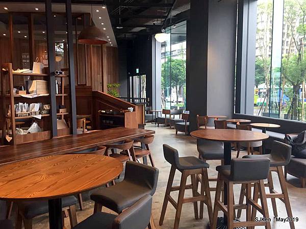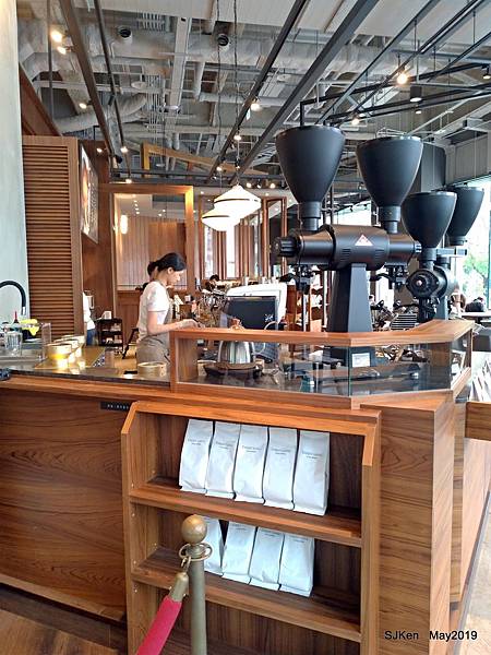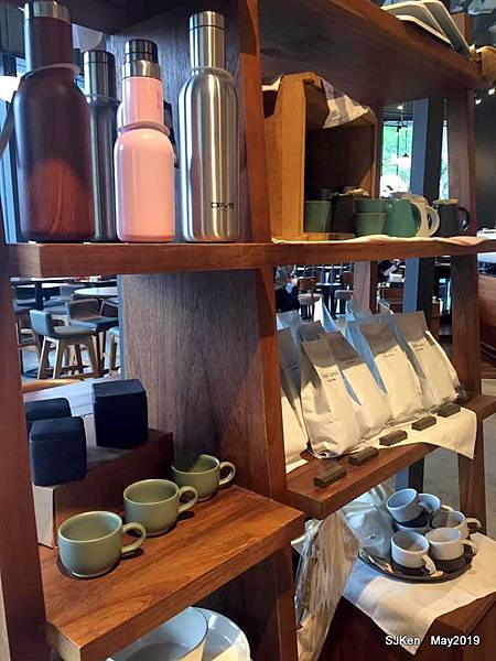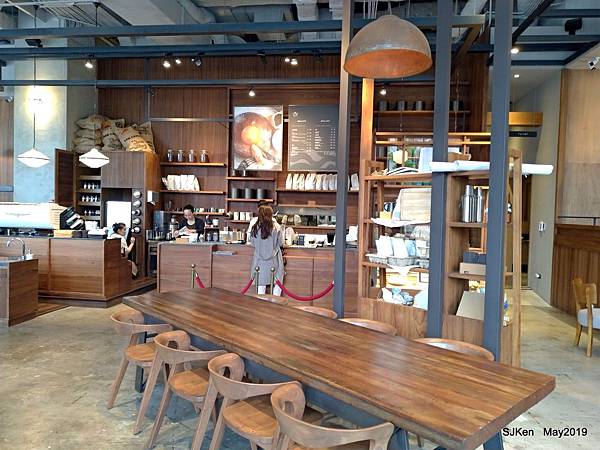 人少的時候,可自行依人數多寡,挑個喜歡的空間桌椅座位,人多就要由店員安排帶領入座後,店員會送上菜單,客人確認後就可前進位於中央的點餐台自行點餐結帳,牆上有巨型菜單,方便客人參考,周邊有很多展示架,販賣與咖啡相關的周邊商品。