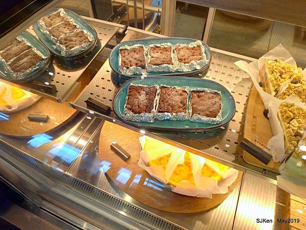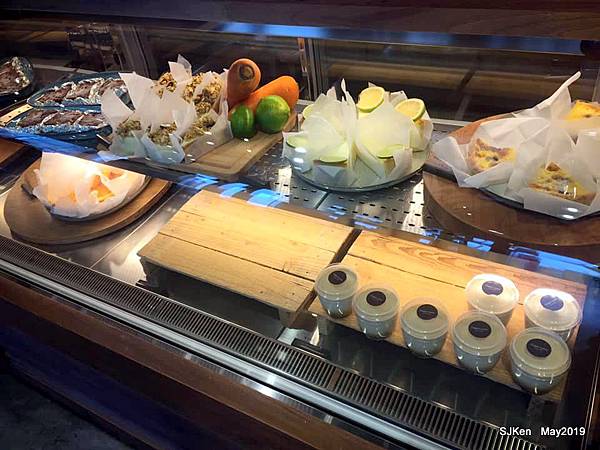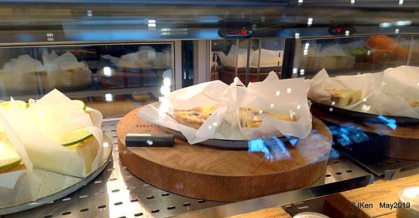點餐櫃台旁還有當日現做的甜點展示櫃區,造型賞心悅目的甜點,道道閃閃發光十分吸睛,加上產品說明與價格標示清楚,方便客人參考點選,當天我們點了「酒漬櫻桃布丁塔」(NT$130/份)、「招牌肉桂蝸牛捲」(NT$108/份)與「乳酪燕麥胡蘿蔔」(NT$140/份)三道甜點。