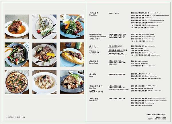 當天我們選了一處靠窗的四人桌入座,店員隨即送上菜單,以下八張菜單圖片取自「CoppiiLumii living coffee 冉冉生活經貿店」官方FB粉絲頁,從204式系列義式淺焙咖啡、213式系列義式深焙咖啡、台灣冷泡茶系列、暖和壺茶系列、多款蔬果汁、鮮果昔、鮮奶、氣泡飲、冉冉大早餐系列、早安/ 午安小碟子、經典奶油短法堡、碗沙拉、手打漢堡排、義大利麵、蔥油米飯大盤子、風味主餐盤系列、甜點、奶油糖厚鬆餅,從台灣本地食材到充滿歐美風情異國料理,主餐到輕食、甜點到飲品,種類之多,讓人目不暇及。